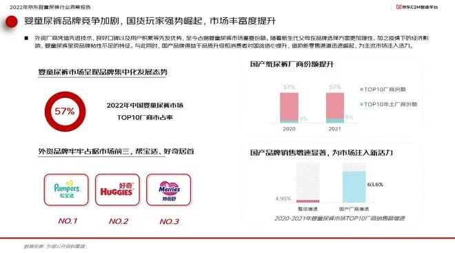 面對(duì)市場(chǎng)空間的變化,國(guó)內(nèi)嬰童尿褲品牌競(jìng)爭(zhēng)加劇。其中外資廠商憑借先進(jìn)技術(shù)、良好口碑以及用戶積累等先發(fā)優(yōu)勢(shì),至今占據(jù)嬰童尿褲市場(chǎng)重要份額。而一方面,隨者新生代父母在品牌選擇方面更加理性,加之疫情下的經(jīng)濟(jì)影響,嬰單尿褲也呈現(xiàn)出品牌粘性不足的特征。與此同時(shí),得益于品質(zhì)升級(jí)和消費(fèi)者對(duì)國(guó)貨信心的提升,國(guó)貨品牌借助新零售渠道迅速崛起,為主流市場(chǎng)注入活力。報(bào)告顯示,本土頭部廠商份額從2020年的5%迅速提升至2021年的8%,而國(guó)產(chǎn)廠商銷售額年增速則達(dá)到63.6%,遠(yuǎn)超行業(yè)整體增速的4.9%。