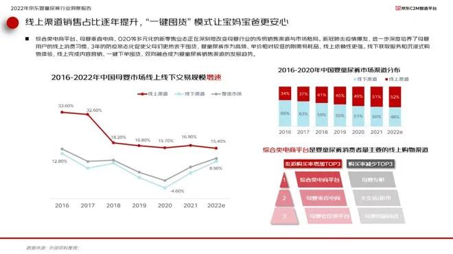 在銷售渠道方面。報(bào)告指出,綜合類電商平臺(tái)、母嬰垂直電商、O2O等多元化的新零售業(yè)態(tài)正在深刻地改變母嬰行業(yè)的傳統(tǒng)銷售渠道與市場(chǎng)格局。新冠肺炎疫情爆發(fā),進(jìn)一步深度培養(yǎng)了母嬰用戶的線上消費(fèi)習(xí)慣,3年的防疫常態(tài)化促使父母?jìng)兏鼰嶂杂诙谪?,嬰童尿褲作為高頻、單價(jià)相對(duì)較低的剛需易耗品,線上依賴性更強(qiáng)。線下獲取服務(wù)和沉浸式購(gòu)物體驗(yàn),線上完成內(nèi)容營(yíng)銷、一鍵下單囤貨,雙向融合成為嬰童尿褲銷售渠道的發(fā)展趨勢(shì)。