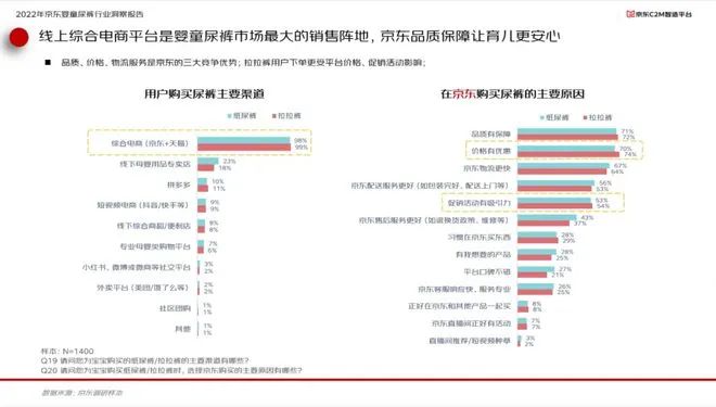 報(bào)告顯示,2022年中國(guó)嬰童尿褲市場(chǎng)渠道分布上,線上渠道占比已經(jīng)超過線下渠道達(dá)到52%,而以京東為代表的綜合類電商是嬰童尿褲消費(fèi)者最主要的線上購(gòu)物渠道。