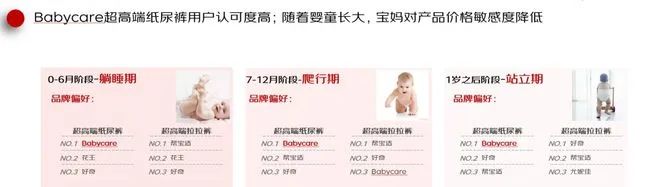 報(bào)告還對(duì)國(guó)產(chǎn)母嬰用品品牌Babycare進(jìn)行了解析,發(fā)現(xiàn)該品牌的超高端紙尿褲用戶認(rèn)可度高,無論是0-6個(gè)月,還是7-12個(gè)月,以及1歲之后階段,Babycare超高端紙尿褲都是用戶品牌偏好榜首。而且隨著嬰童長(zhǎng)大,寶媽對(duì)產(chǎn)品價(jià)格敏感度降低,Babycare超高端紙尿褲成為了諸多寶媽的首選產(chǎn)品。